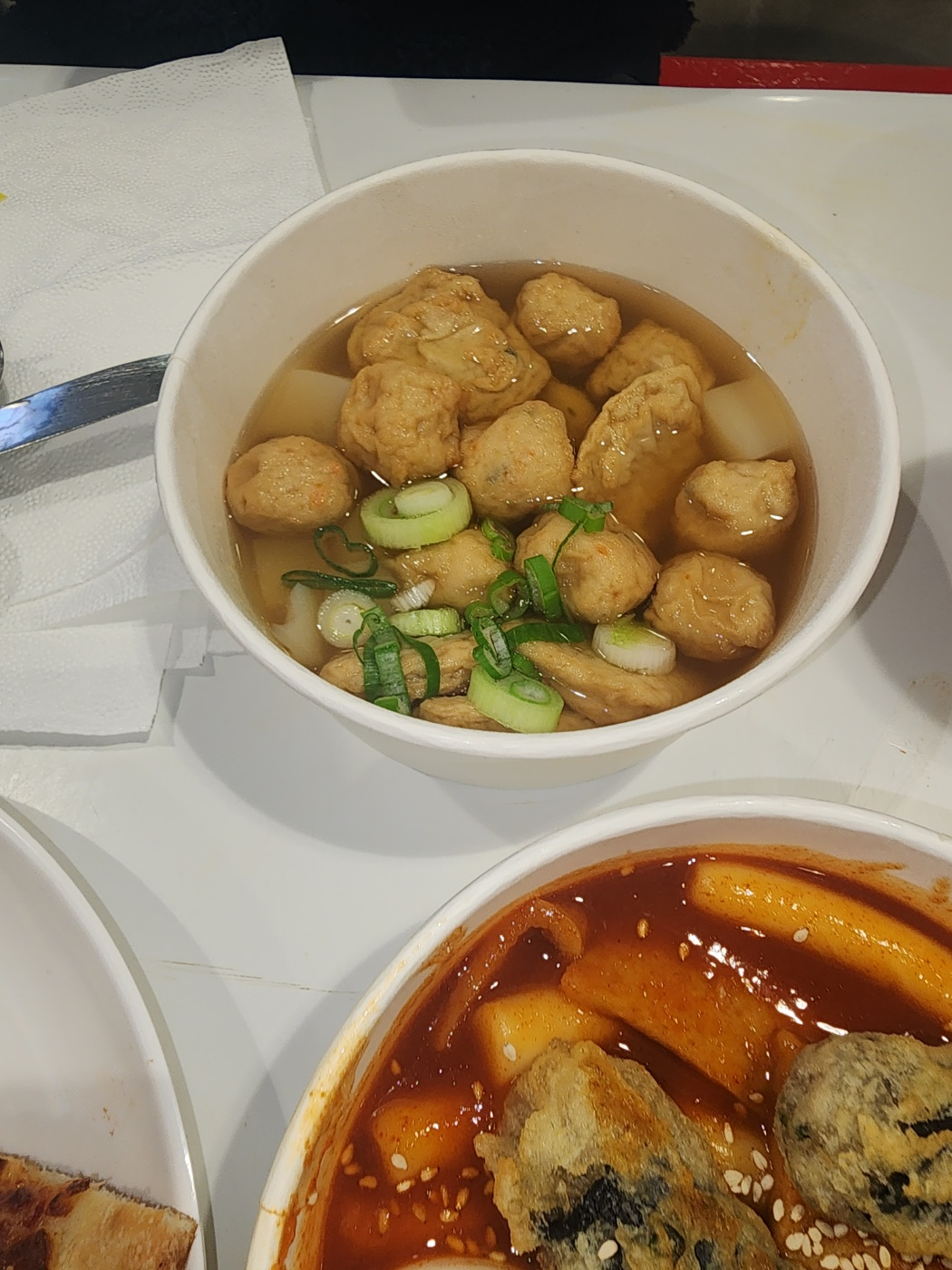 어묵은 사각어묵 동그란 어묵 그리고 곤약을 잘라서 파를 올려주는데 국물이 뜨끈하고 맛있어서 떡볶이 하고 같이 먹으면 한 끼 식사가 제대로 되며 그와 더불어 치즈피자한쪽을 시켜서 반으로 잘라 같이 먹으면 느끼하지 않으면서